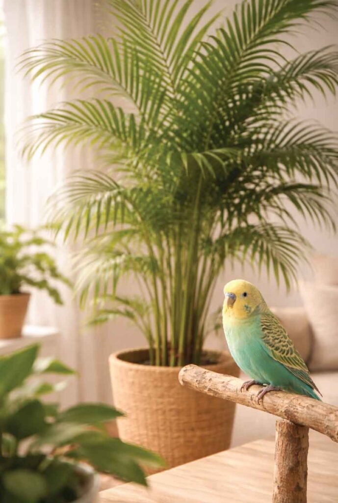 Let’s talk about the areca palm, which is basically a piece of functional bird furniture disguised as a houseplant. This one’s particularly great if you have smaller birds like budgies, cockatiels, or lovebirds.