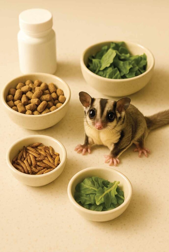 Experienced owners often prepare BML diets, TPG diets, or Wombaroo-based recipes, which require fruits, protein sources, insects, supplements, and fresh produce.
